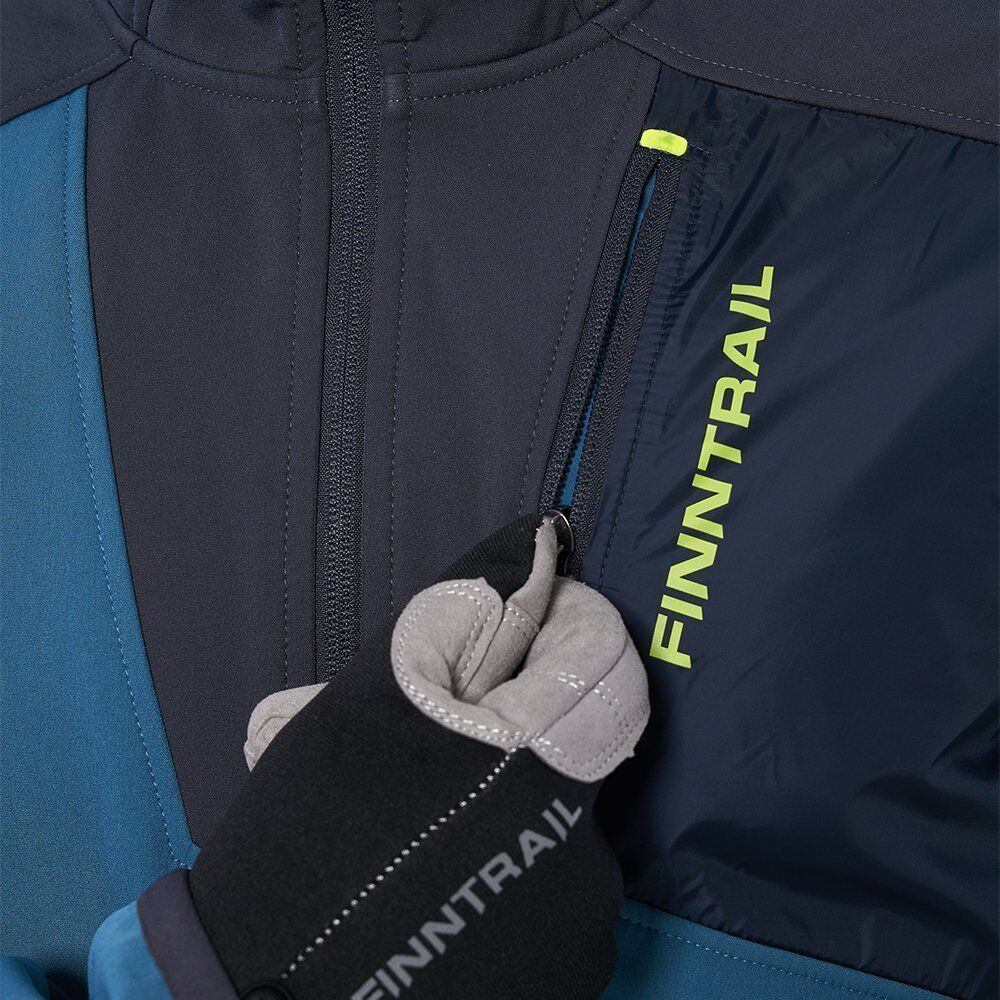 Softshell windproof water-repellent jacket, 3-layer SOFTSHELL fabric, fleece lining, slim fit, elasticated edgings for comfort and protection from wind, cold and rain, wind flap under the center zipper, zippered chest pocket and two side pockets, Sleeves and hood with elastic ribbing, original FINNTRAIL design