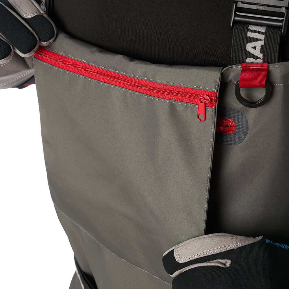 when the seams start to fray, they begin to leak. Therefore, the fewer seams the waders have, the more durable and reliable the product is. The area below the waist is additionally reinforced with a durable four-layer fabric with a HARD-TEX membrane. The waders are equipped with two water-resistant pockets, D-loops, drying loops, elastic suspenders and a belt with a YKK buckle. A waterproof smartphone pouch and a carrying bag are included.