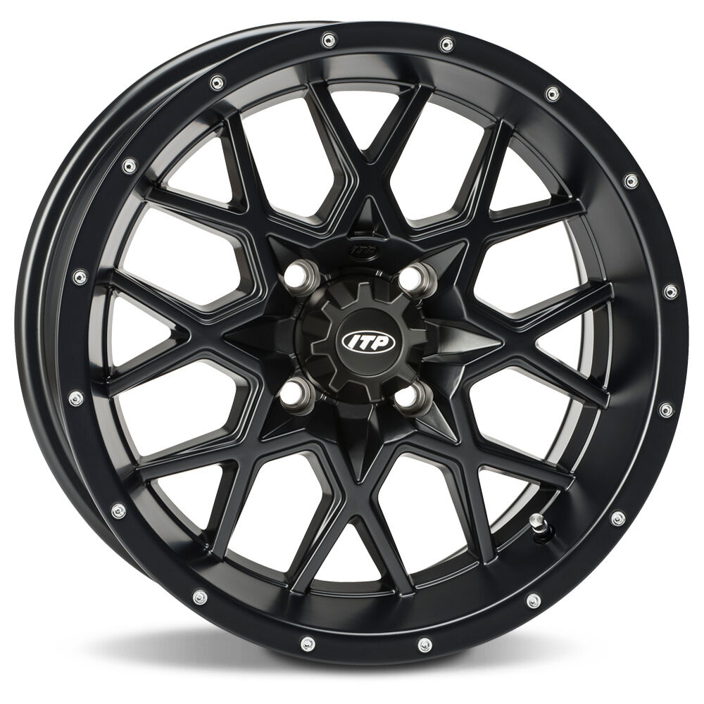 The great looking and ultra-durable Hurricane wheel for utility ATVs is the first release in ITP's Storm series wheels. This rim features eight sets of x-shaped spokes giving it a very unique and heavy duty design. It also features the ITPs exclusive Rock Armor inner wheel lip which provides unequalled structural integrity. In super popular matte black finish.