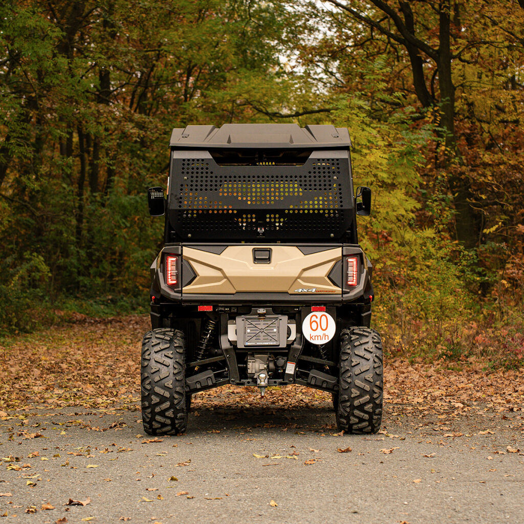 Utility UTV E5+, liquid-cooled single cylinder engine, CVTech automatic transmission, L / H / N / R / P , 2x4 / 4x4 , independent suspension with double A-arms front and rear, EPS electric power steering, gas assisted tiltable cargo box; 4x hydraulic disc brake, front bumper, hitch ball, 3000lbs winch with remote control, LED rear lights, aluminum wheels