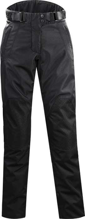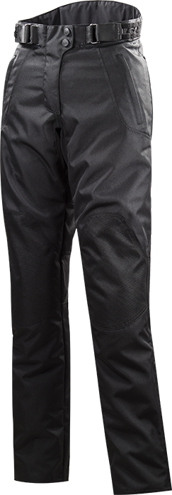 Womens motorcycle pants with waterproof membrane, removable thermal lining, stretch panels at the knees and crotch, removable CE approved protectors on the hips and knees, anti-slip seat patch, two side pockets, connection zipper