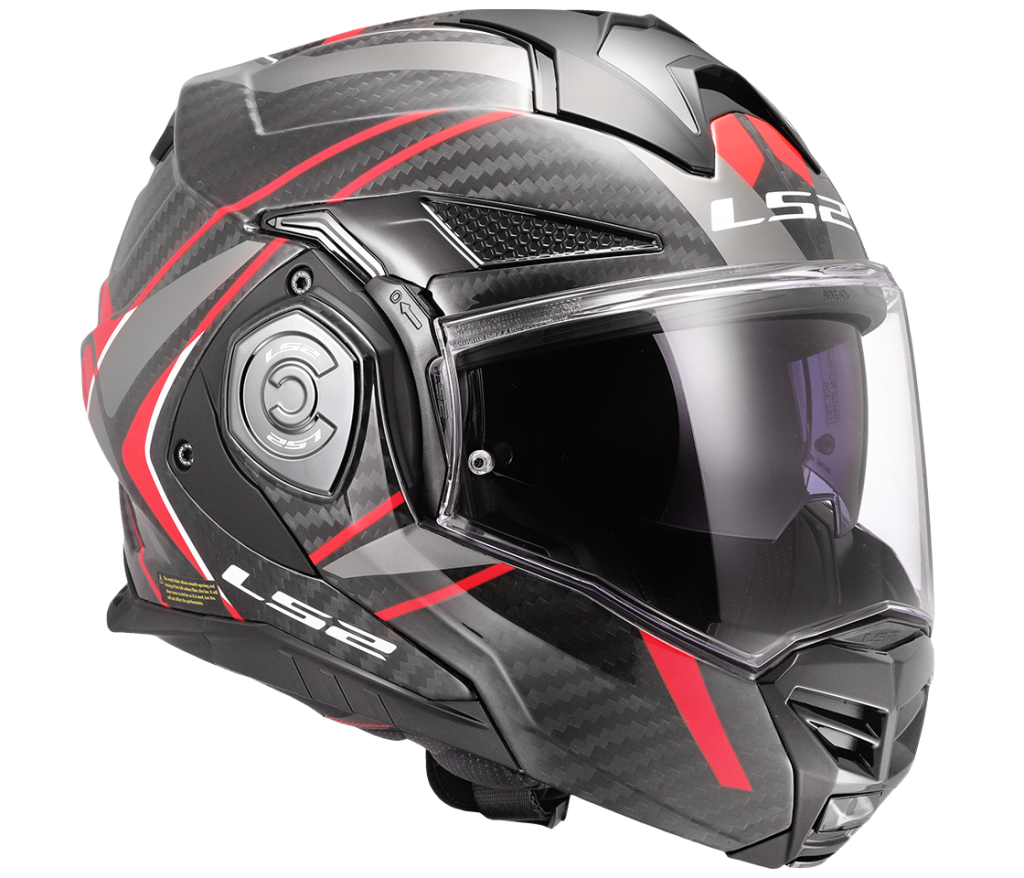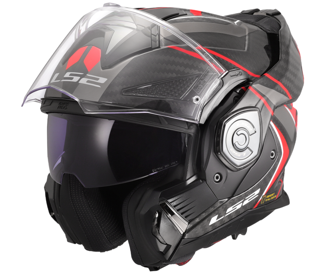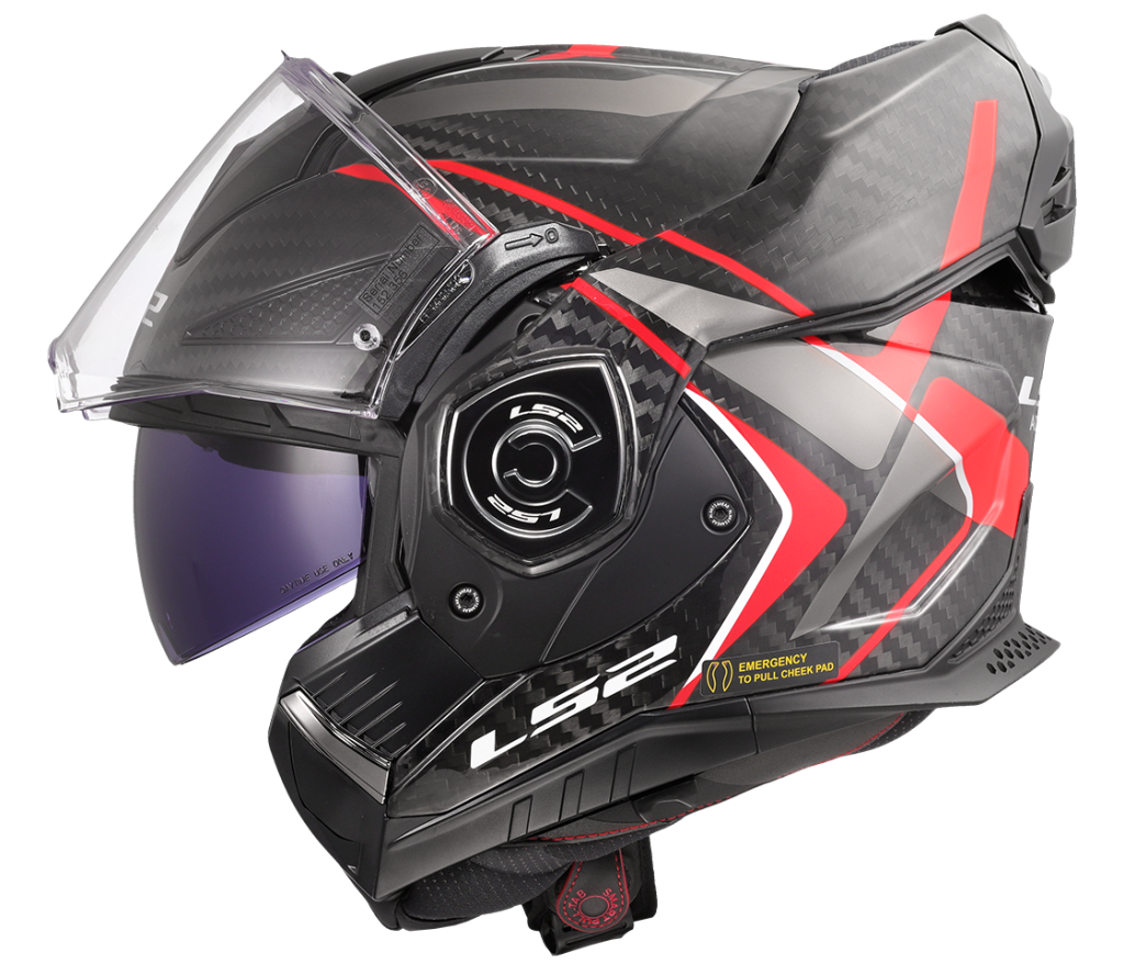 Technically advanced high-end carbon touring convertible helmet, redesigned 180-degree folding mechanism, integrated sun visor, lightweight Carbon fiber shell, Anti-scratch visor, removable and washable liner, Emergency Quick Release cheek pads, Pinlock 70 Max Vision included, 1550g. The only full carbon convertible helmet on the market.