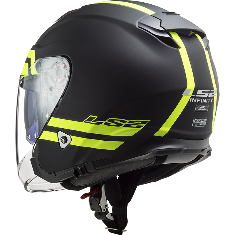 Fiberglass open face helmet in attractive high-visibility fluorescent design with sun shield offers ultimate sense of freedom wrapped in a technically advanced modern construction. Whatever your favorite style of riding - from everyday commuting in- or into the city jungle up to long-distance trips perhaps to Australia, the LS2 Infinity helmet offers comfort, quality, protection and attractive eye-catching design. The shell is made of ultra-light, ultra-strong HPFC Fiberglass Composite with excellent energy dispersion for high safety. Twin Shield System features integrated sun visor and clear, Anti-scratch, Anti-fog, UV-resistant face shield. Fully adjustable ventilation with channeled EPS liner keeps you comfortable all the time. Completely removable and washable hypoallergenic interior. LS2 OF521 Infinity is a world class helmet at an unbelievable price. Light weight - only 1100g!
