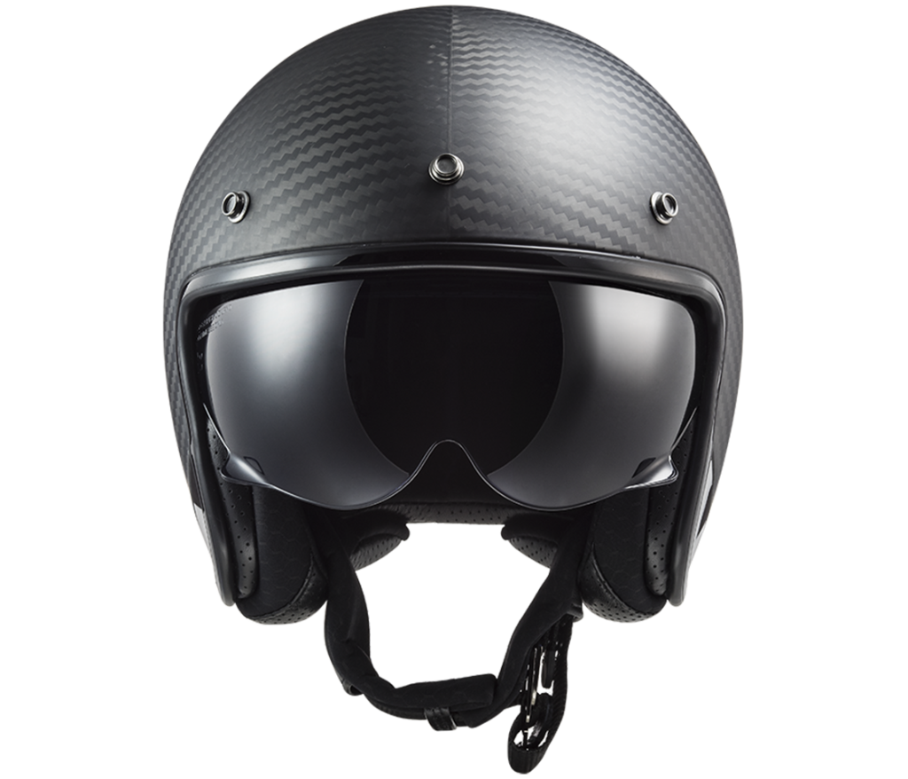 Ultimate carbon jet helmet in fashionable neo-retro design, extremely light full carbon fibre shell, retractable sun shield, comfortable hypoallergenic lining, Double-D ring fastening, removable sun peak, weight only 850g