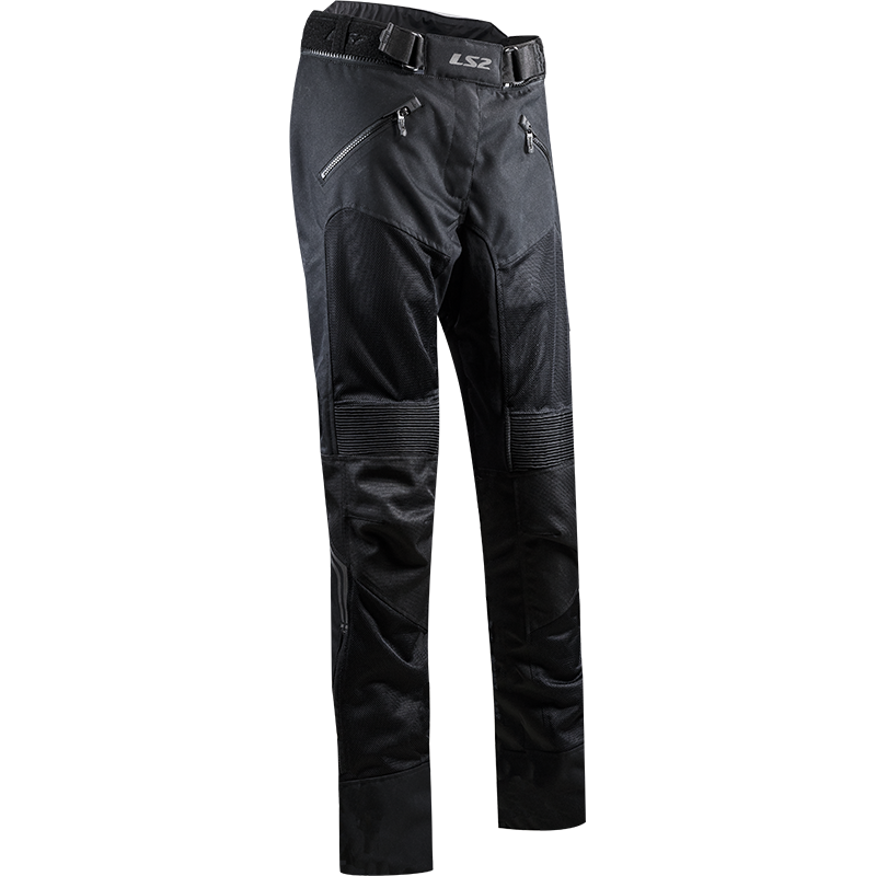 Ladies motorcycle pants, adjustable leg opening, stretch panels at the knees and crotch, removable CE approved knee protectors, anti-slip patch on the back, two side pockets, jacket connection zipper