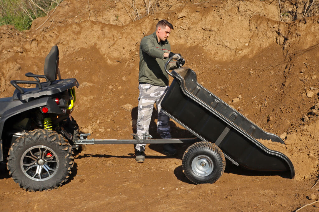 Light multipurpose tipping ATV trailer, max. load 680 kg, easy to maneuver, perfect for small to big jobs, heavy-duty polyethylene tub, sturdy all-steel powder coated frame, weight 54,5 kg, LxWxH: 175,5 x 101 x 45,5 cm, wide-profile low pressure 18" tires