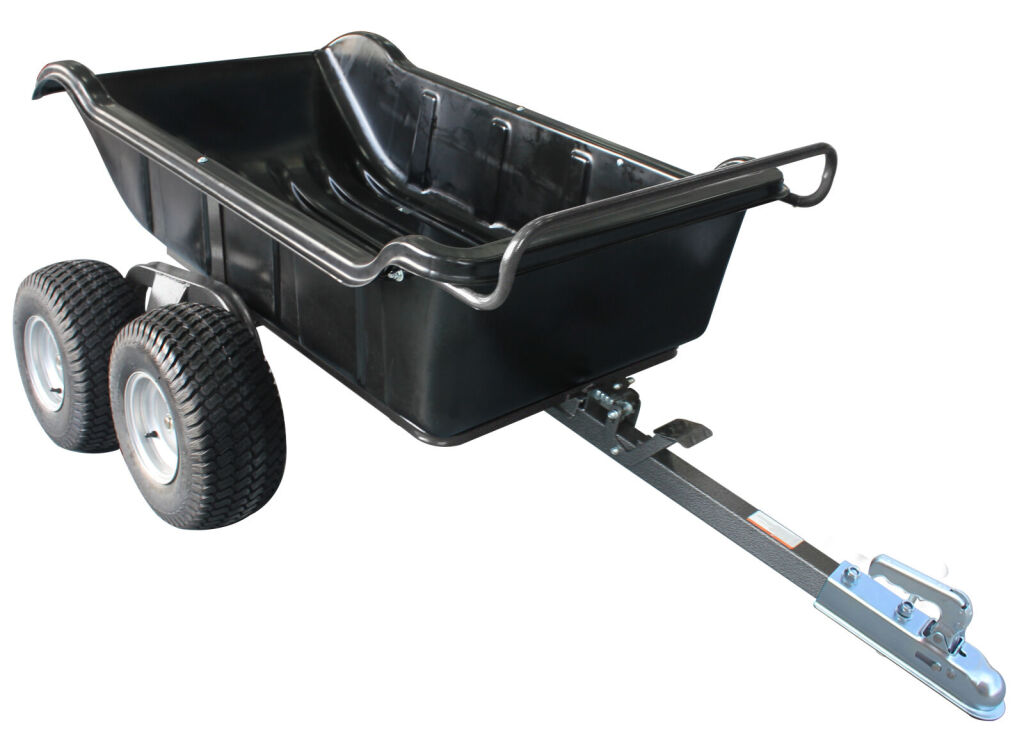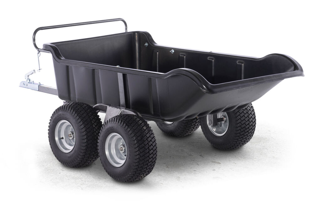 Robust 4wheel tandem axle ATV trailer, max. load 680 kg, tipping heavy-duty polyethylene cargo bed, sturdy all-steel powder coated frame, 18" wide-profile low pressure tires