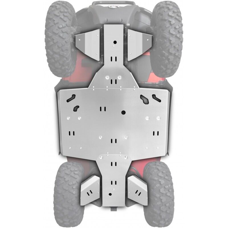 Complete aluminum undercarriage protection, CFMOTO CFORCE 450-520 L (2022+) constructed from hardened aircraft-grade 4mm 5754-T5 aluminum, includes front, central and rear skidplates, front A-arm guards and rear suspension guards, natural aluminum finish, easy installation, including all mounting hardware